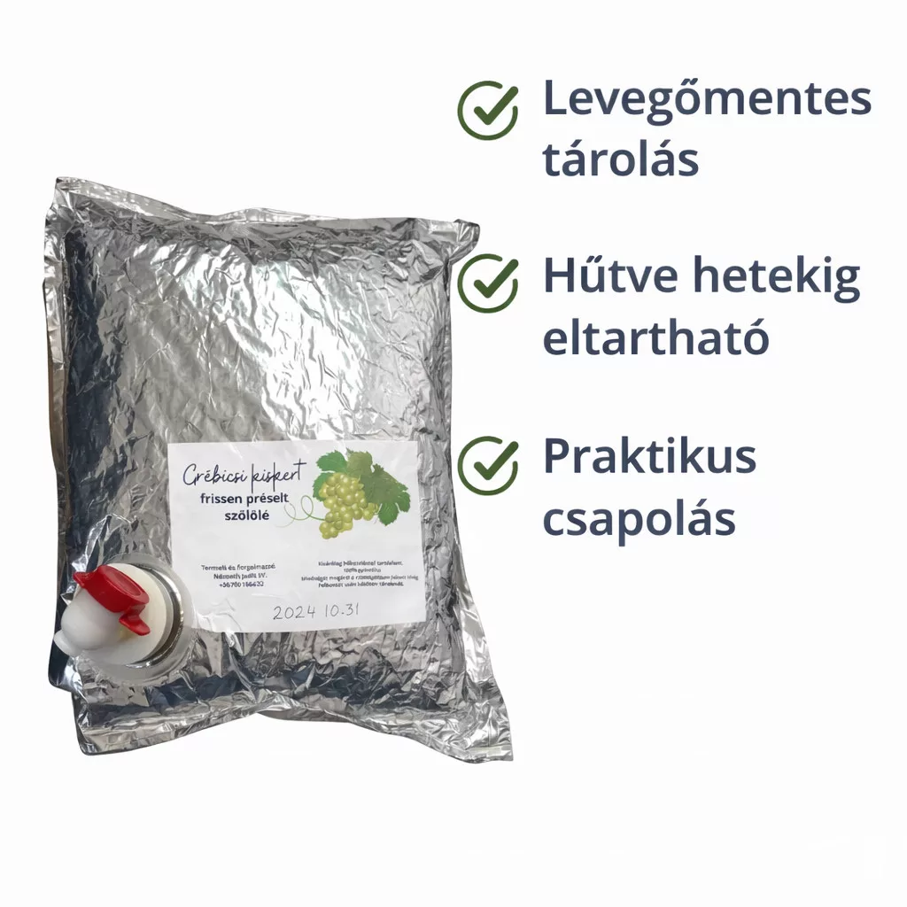 Remeselná hroznová šťava v 3-litrovom balení bag-in-box je ideálnou voľbou pre rodinnú spotrebu, pohostenie hostí alebo sviatočné príležitosti. Produkt je vyrobený z čerstvo lisovaného, starostlivo vybraného hrozna a šetrne pasterizovaný.